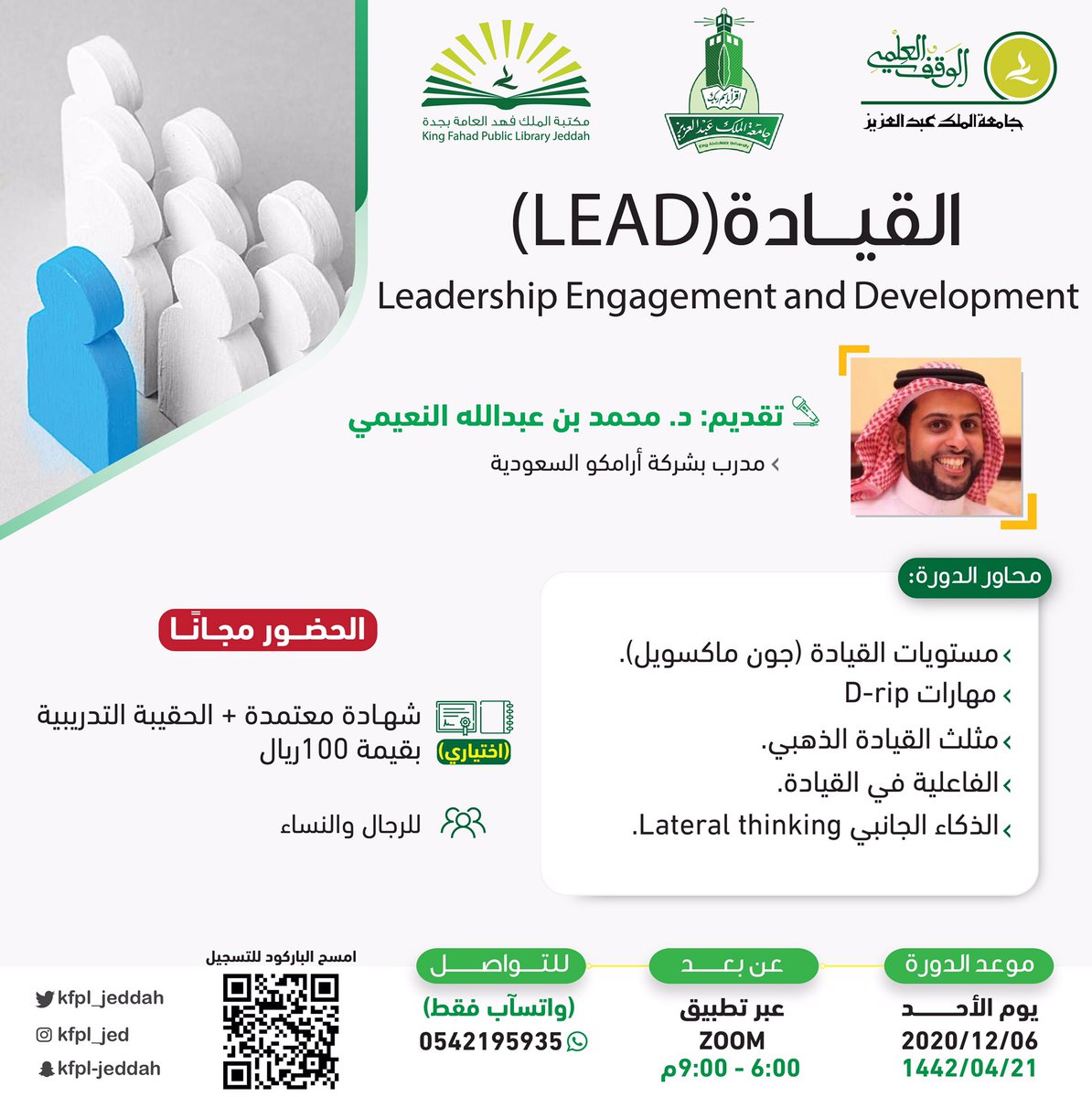 أعلنت مكتبة الملك فهد العامة بجدة إقامة 4 تدريبية (عن بُعد) بعدة مجالات، بالعناوين التالية (مهارات التعبير الإبداعي، واستراتيجيات النجاح، والقيادة، وإدارة مواردي المالية)، وذلك وفقاً للتفاصيل الموضحة أدناه.