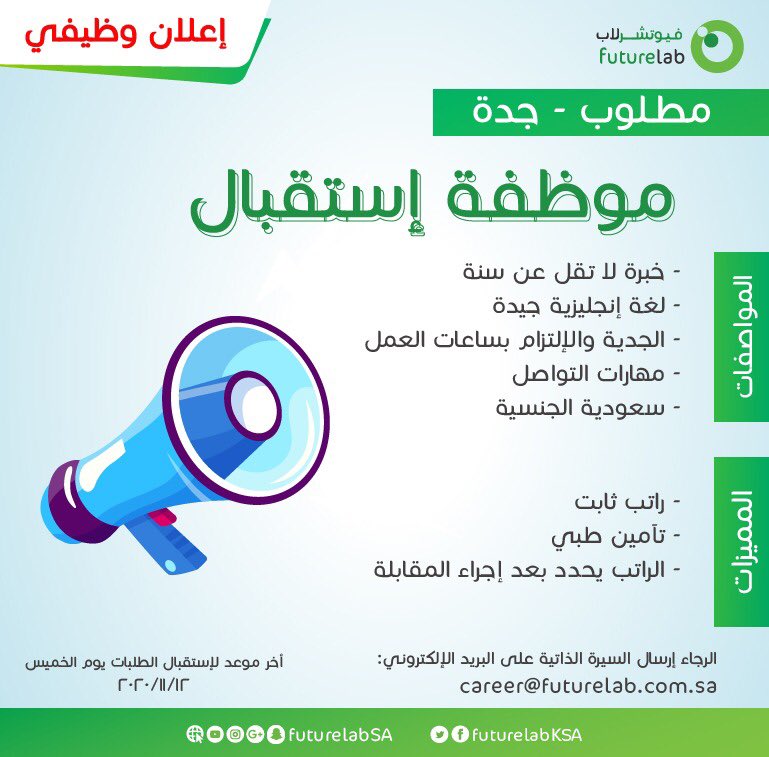 أعلنت مختبرات فيوتشرلاب توفر وظائف نسائية لحملة الثانوية فما فوق بجدة، واشترطت الشركة أن تكون المتقدمة سعودية الجنسية، وذلك وفقاً لبقية الشروط والتفاصيل الموضحة أدناه.