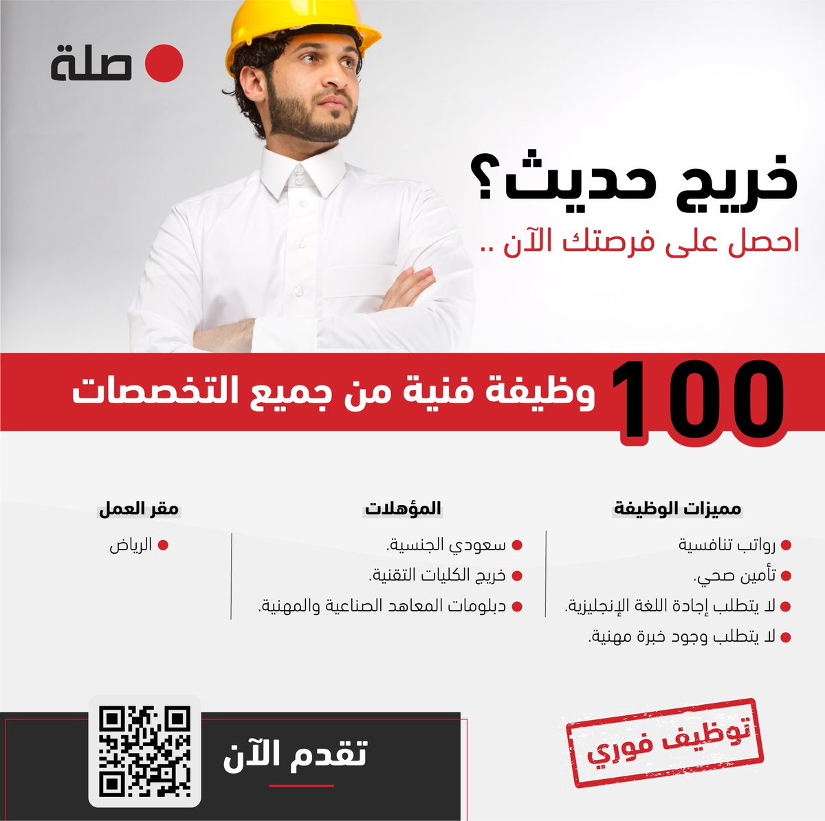 أعلنت شركة صلة توفر 100 وظيفة فنية لحديثي التخرج في جميع التخصصات بالرياض، وذلك وفقاً لبقية التفاصيل الموضحة أدناه.