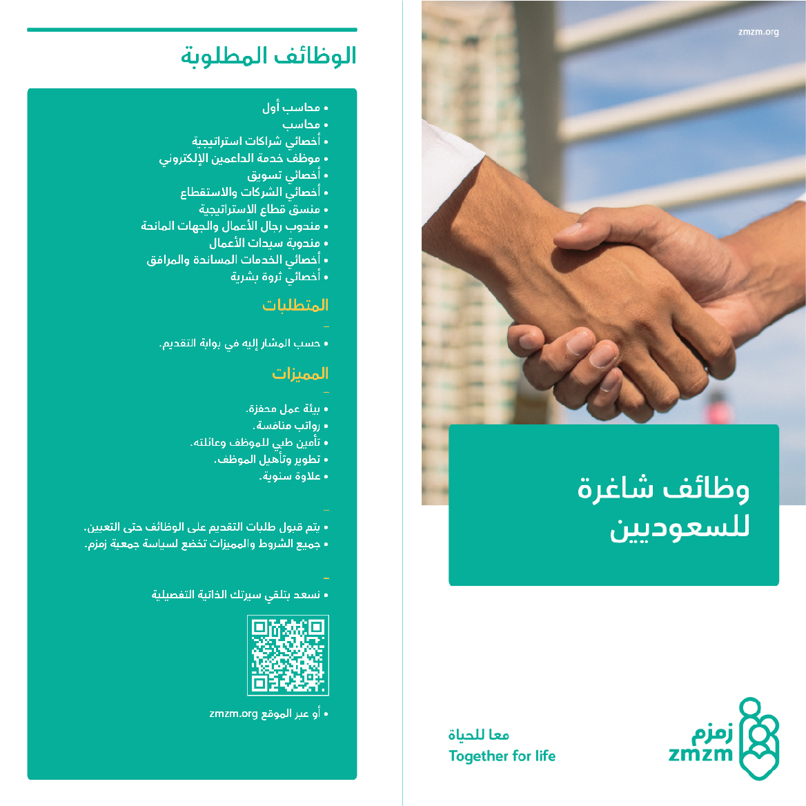 أعلنت جمعية زمزم للخدمات الصحية التطوعية توفر 11 وظيفة للجنسين لحملة الثانوية فما فوق، واشترطت الجمعية أن يكون المتقدم أو المتقدمة سعودي الجنسية، وذلك وفقاً لبقية التفاصيل الموضحة أدناه.