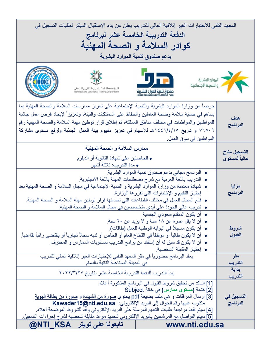 أعلن المعهد التقني للإختبارات الغير إتلافية العالي للتدريب بدء التسجيل (الدفعة التدريبية الخامسة عشر) في (برنامج كوادر السلامة والصحة المهنية) بالمدينة الصناعية الثانية بالدمام، ويستهدف البرنامج (الباحثين عن عمل)، علماً بأن البرنامج مدعوم بالكامل من صندوق تنمية الموارد البشرية (هدف) لمن تنطبق عليهم الشروط، وذلك وفقاً للتفاصيل الموضحة أدناه.