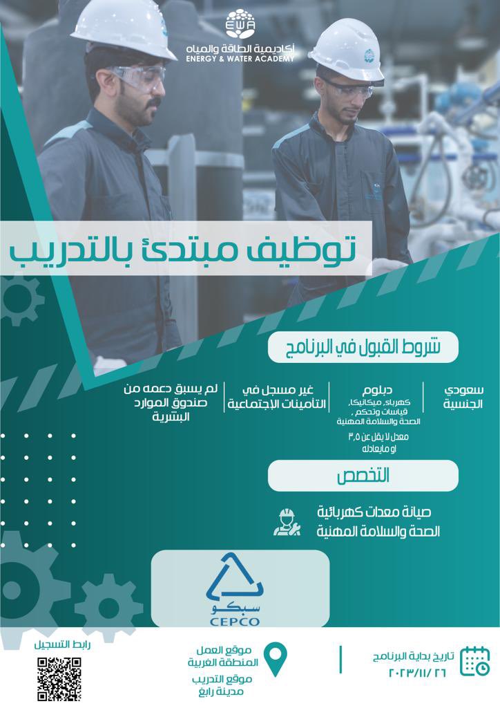 أعلنت أكاديمية الطاقة والمياه عن بدء التقديم لبرنامج التدريب المبتدئ بالتوظيف بالتعاون مع شركة (سبكو)، لحملة الدبلوم في مختلف التخصصات الفنية، وذلك وفقاً للتفاصيل وطريقة التقديم الموضحة أدناه.