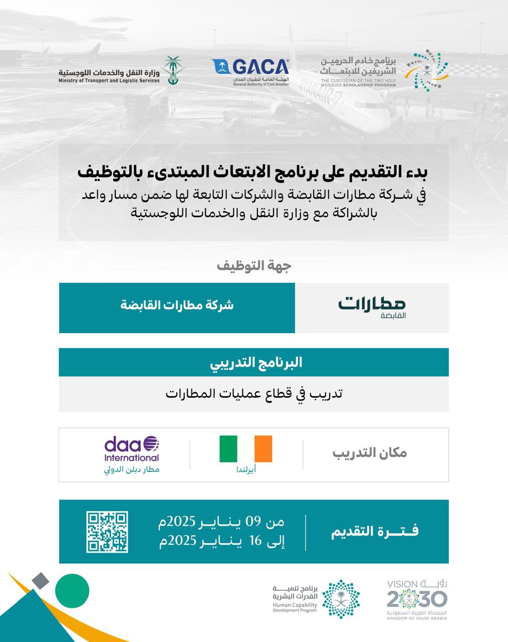 أعلن برنامج خادم الحرمين الشريفين للابتعاث عن فتح باب التقديم في برنامج الابتعاث المبتدئ بالتوظيف المقدم من شركة المطارات القابضة ضمن مسار واعد أحد مسارات برنامج خادم الحرمين الشريفين للابتعاث الخارجي وذلك بالتعاون مع وزارة النقل والخدمات اللوجستية، وذلك وفقاً للتفاصيل الموضحة أدناه.