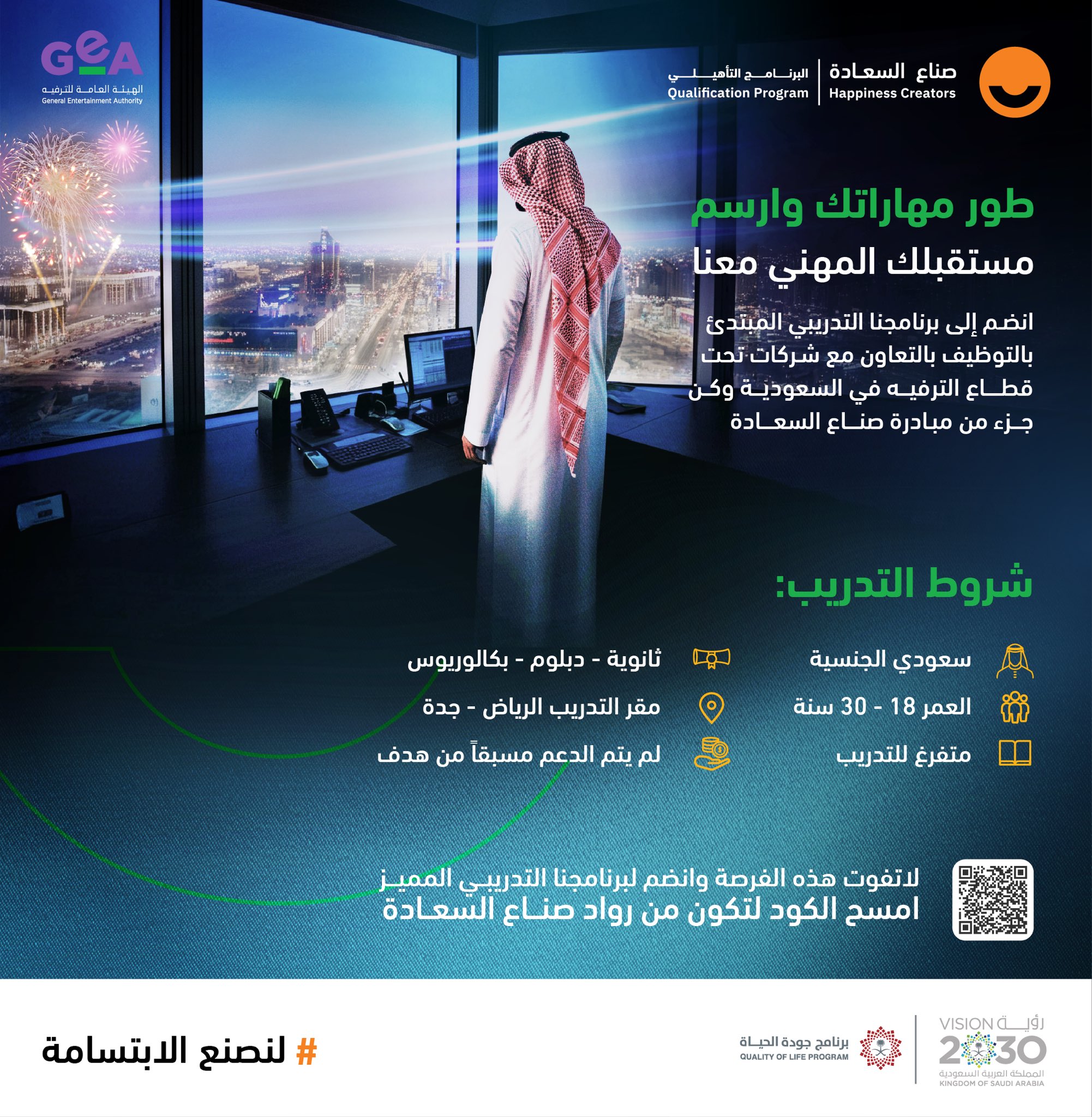 أعلنت الهيئة العامة للترفيه عن برنامج (صنّاع السعادة) المنتهي بالتوظيف بالتعاون مع شركات قطاع الترفيه بالمملكة (ثانوية فأعلى)، وذلك وفقاً للتفاصيل الموضحة أدناه.